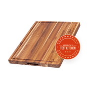 When America's Test Kitchen dubs a cutting board 'the last one you'll ever need,' we listen. This hefty Teakhaus carving board earns that praise with its rock-solid 20 by 15 inch teak surface, perfect for tackling holiday roasts or weeknight veggie prep without a wobble. We love the edge grain construction that stays gentle on your knives yet tough enough for daily duty. The deep juice canal catches every drip on one side, while the flip reveals a clean flat surface. Those built-in hand grips? They make shuttling this 12-pound beauty from counter to table a breeze. Food & Wine crowned it their Best Large Board, and we're all in. Crafted from FSC-certified sustainable teak, it just gets better with a little mineral oil love. Grab this gem and carve out kitchen memories for decades. • Edge grain teak construction rated 'Best Heavy Duty' by Cook's Illustrated • Deep juice canal on one side; flat surface on reverse • Generous 20 × 15 inch cutting surface • Built-in hand grips for easy transport • FSC-certified sustainable teakwood **Crafted in Thailand from sustainably harvested teak.**