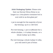 • 1 jar brines up to 14lb bird (dry) or 8lb turkey (wet)
