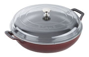 The Staub 3.5-Quart Braiser with Glass Lid is the ultimate cookware for one-pot meals, slow-cooked braises, and simmered soups. Featuring a domed glass lid, this braiser locks in moisture while accommodating large cuts of meat, ensuring your dishes stay juicy and flavorful. Made from high-quality enameled cast iron, it offers exceptional heat retention and even cooking. The black matte enamel interior requires no seasoning and promotes exceptional browning. Rooted in French culinary tradition, Staub cookware is beloved by both home and professional chefs for its durability, craftsmanship, and timeless design. This heirloom-quality braiser transitions seamlessly from stovetop to oven to table, making it as beautiful as it is functional.