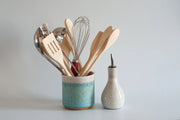 Our ceramic kitchen canister holds utensils and serving spoons and has speckled white interior and rim with drainage hole. This piece is great for adding a splash of color to your kitchen, while keeping your utensils organized.