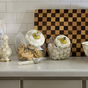 Nothing welcomes folks to your kitchen quite like the sight of fresh-baked cookies piled high, their buttery scent mingling with the warm coffee tones of a lid that feels like an old favorite. We adore MacKenzie-Childs' Cookie Jar with Mocha Check Lid for turning cookie storage into a charming display that begs for a hand. They've paired a clear glass body that teases what's inside with a heavy-gauge steel lid, hand-glazed and painted in those layered mocha checks, then topped it with a brass bobeche and clear glass finial for just the right sparkle. At 6 inches wide and 8 inches tall, it holds a full gallon to stash your weekly bake or holiday shortbreads, keeping them crisp and out of sight until it's time to share.