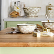 Let your quick kitchen wins feel a little warmer with the MacKenzie-Childs Mocha Check Small Everyday Bowl. We chose this sweet 6-cup starter for the way it tucks into tight spots during solo meal prep or lazy weekend mixes, with MacKenzie-Childs artisans brushing those coffee-hued checks over a heavy-gauge steel base that stands up to real-life spills and stirs. The bronzed rim gives it that gentle glow we crave, and at 7.75 inches wide with a cozy 3.5-inch height, it nests perfectly with the medium, large, and extra-large sizes to keep your counters clear and your flow uninterrupted.