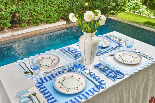 View full detailsIs there anything more delightful than a beautifully set table? With Misette's Jardin Embroidered Linen Scalloped Stripe Napkins in Blue, your dini...