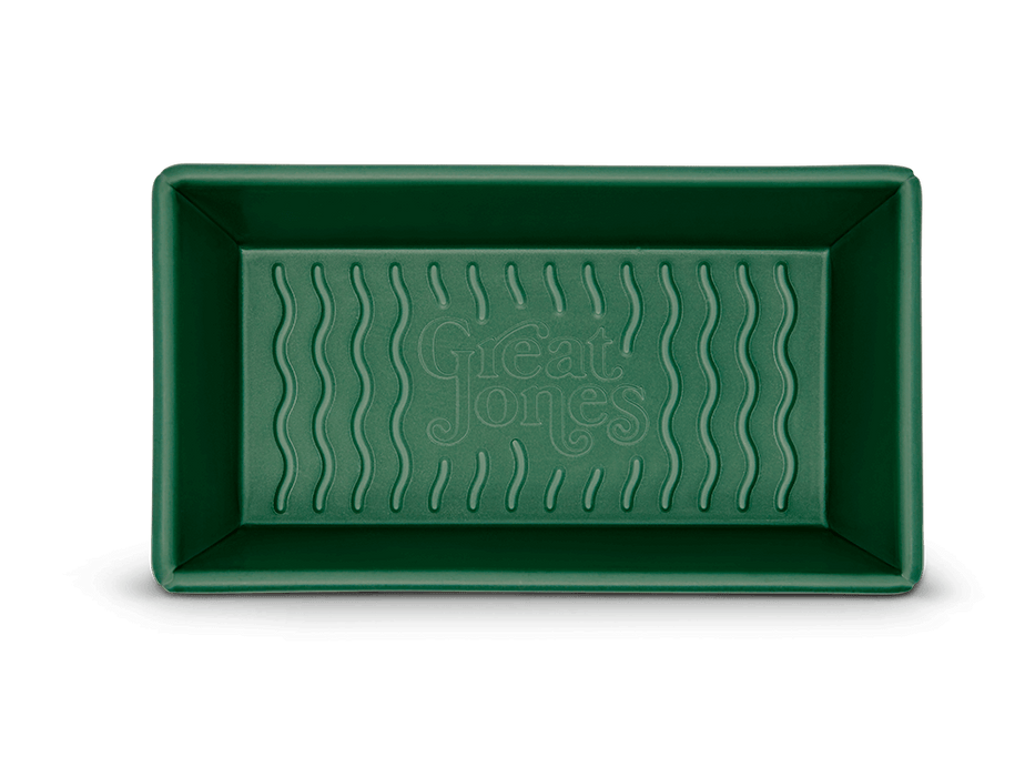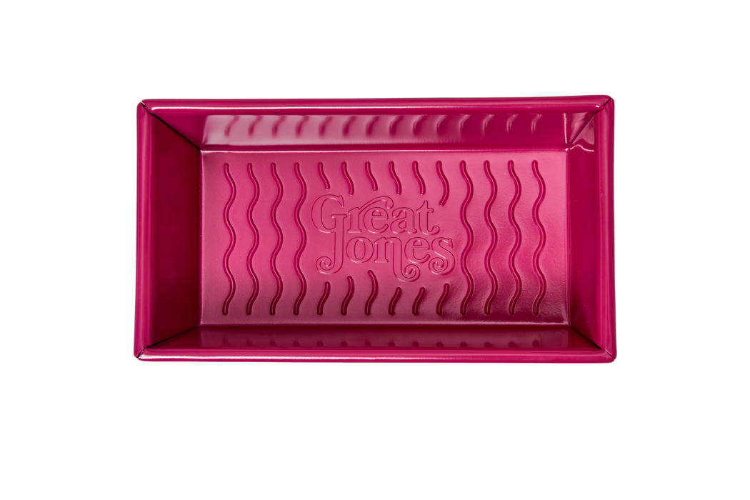 Bake perfect loaves with the Great Jones Breadwinner in Blueberry! This 1-lb loaf pan features a custom nontoxic, nonstick coating and a signature wavy, corrugated bottom for effortless release and scratch resistance. Crafted from aluminized steel, it ensures even baking and easy cleanup. Oven-safe up to 450°F and dishwasher-friendly (hand wash recommended), it holds 6 cups and makes baking a breeze.