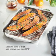• UNRIVALED DURABILITY - Heavy-duty stainless steel pan and rack are ultra-durable for a lifetime of oven roasting and baking